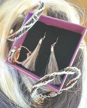 Ten to 50 hairs go into each section, depending on the order. Metallic threads in silver, gold, blue, teal, purple, or pink are combined into the braid for accent. For some bracelets, pendants and earrings, Jennifer orders sterling silver from Indonesia that’s made specifically for horsehair keepsake jewelry, with special pockets to hold the hair.