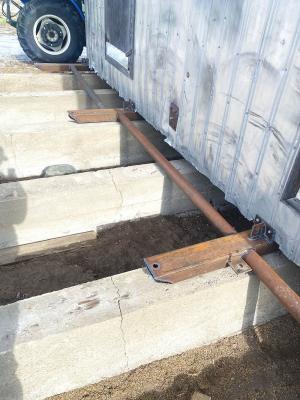 Bray and his brother-in-law used five bottle jacks to lift the granary off its cement pillars. It was heavy enough that they only raised one side at a time before setting it down on a steel skid. The skid consisted of heavy-wall 4 by 6-in. steel tubing. The tubing was laid on top of the concrete pillars before pipe lengths were welded in place as spreaders. Once on the skid, the building was pulled to Bray’s farmstead with the D7.