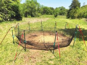 The resulting circular traps are 20 ft. in diameter and can be either attached to trees or used with 6 1/2-ft. T-posts driven into the ground. The netting hung on the inside of the posts or trees is heavy-duty and specially engineered with a drop strength of just under 8,000 lbs. to sustain the assault of even the largest pigs trying to escape.