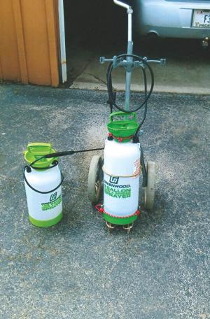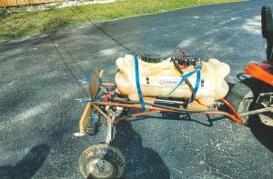 To reach smaller places, Mickelson adapted his golf cart to hold a 2-gal. spray tank secured with bungee cords that he could easily pull around the yard.
