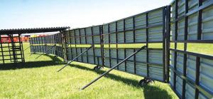 Panels must be porous to properly break the wind, allowing some wind through. Each Rawhide Portable Corral panel has a lateral 5-in. slot midway top to bottom. Spaces at hinge points between panels also allow wind through, as does the wheel height space below the panels. Each panel is perimeter framed and cross framed with 14-gauge, 2 by 2-in. square tubing. The ridged skin on the panels is 16-gauge steel siding.
