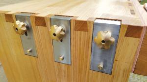 The vice can also be flipped around so the leather jaw faces out and the vice screws are placed in the slotted holes. It can then be raised, providing a stop, so boards can be securely held while still giving access to the top surface.