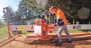 Mehlhorn likes the portability of Turbosawmill models. The power carriage operates on a beam suspended from two end frames.