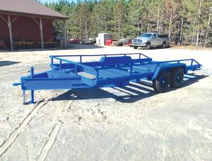 Shop-Built Trailer Still Rolling After 25 Years MISCELLANEOUS EQUIPMENT Miscellaneous After building and selling six trailers Norman Sieting built one that satisfied him While he eventually sold it to a neighbor he kept a close eye on it and used it as needed Recently he even helped with an upgrade After 25 years and three deck replacements and repainting Sieting reports the trailer is still going strong It has traveled as far as Colorado and Tennessee without a problem “I built my first one and a friend begged me to let him buy it ” says Sieting “I built a new one and when I started using it I started building another When I put a deck on the new one the old one would go up for sale Every trailer I built got better ” By the time he built his last trailer an 8 by 16-footer he had an innovative design He started with a 40-ft length of 4 by 6-in 3/8-in angle iron After marking off 16 ft at either end he notched the corners and then started heating them “Once it was hot enough I could bend it by hand with a helper holding the other end of the angle iron ” recalls Sieting “Once I heated and bent the second 16-ft length I had a U-shape frame with 16-ft sides and an 8-ft center ” At the time many trailer house tongues were available at scrap metal prices Sieting bought some and used one as a trailer tongue He cut others into 8-ft lengths each 10 in wide Sieting split them in half lengthwise and welded them in place as 5-in wide frame cross members “I mounted the frame on 7 000-lb tandem axles also salvaged from a house trailer ” says Sieting “I cut out the original mobile home brakes and put in replaceable brakes ” At the rear end he mounted an 8-ft bumper made of Schedule 80 4-in dia pipe Sieting left 4 in between it and the end of the deck so he could wrap chains around it to secure loads The pipe also served as a mounting point for ramps “I cut a short length of the next larger size pipe in half lengthwise and welded each piece to the end of a car ramp ” says Sieting “I could set the ramps in place and slide them to the right position for loading a vehicle ” Sieting wanted a tilting bed To make it he set the trailer house tongue under the first third of the trailer bed and pinned it to the frame This required exact measuring as he first welded two 1-in thick 5 by 8-in steel plates with 1-in dia holes to each side of the frame It also required heating and bending the ends of the V-shaped tongue so they would fit between the plates He notched the 10-in wide tongue members at their midpoint to seat the bed in transit “When a lot of weight is placed on the front end of the trailer it wedges the trailer bed into the notch ” says Sieting Before pinning the tongue to the frame he drilled holes to match those in the steel plates He also welded 4-in boss ring to reinforce each 1-in hole in the tongue “When we mounted the trailer frame to the tongue the steel plates had to fit over the tongue and the bosses and all the holes had to line up exactly ” says Sieting “It was tricky as I was using 1-in bolts so there was no play ” He fabricated hold-downs with stainless steel rods that ride inside pipe welded to the tongue Slots in the pipe allow levers welded to the rods to slide the rods back and rotate them locking them down on tabs welded to the trailer frame Channel iron is welded to the top center of the trailer frame A 2 000-lb marine winch comes on an adapter with slotted holes Studs screwed into holes threaded into the channel iron provide a solid anchor for the winch Sieting welded flat stock with gussets and fenders to the top edges of the 4 by 6-in trailer frame sides This provided a surface for mounting side rails of 2 by 2-in steel tubing “I also built a toolbox into the tongue ” says Sieting “It holds the winch binders and chains ” Although the seventh trailer may have been his best that didn’t mean it couldn’t be improved Recently his neighbor brought it back to Sieting to make a change “We added 20 in to the rear end but sloped it about 5 degrees ” he explains “Now he releases the retainers on the bed and when he drives his front wheels onto the extensions the trailer tilts and he can drive on the rest of the way When he gets past the halfway point it returns to level ” One more change was made to the trailer with its latest upgrade “I always used 2-in thick home-sawn ash for the deck ” says Sieting “This time my neighbor went with manufactured decking The laminated sheets look good and should last a long time ” Contact: FARM SHOW Followup Norman Sieting 6112 Walker Rd NW Rapid City Mich 49676 ph 231-564-1031; normansieting@gmail com