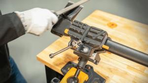 “The all-metal IQ Vise has a ball and socket joint that is extremely sturdy with a hardened steel ball,” says Brandon Smith, director of business development. “It has all of the functionality of a normal bench vise, and with it placed on the edge (of a bench), you can lean it over to work on items like chainsaws or string trimmers.”