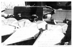 What he did was to make a frame out of steel tubing that fastens to the top back edge of the header. It extends out over the feed auger and is covered by steel mesh that stops pitchouts yet doesn't block the view. Hanging from the end of the steel frame is a large rubber flap made out of a piece of conveyor belting. It stops ears that are thrown forward.