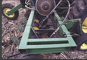 "It all started a couple years ago when we decided to switch our corn from 38 to 22 1/2-in. rows for the earlier canopy and better weed control that narrow rows offer. We'd been using a Deere 7000 four-row planter but the ripple coulters we'd added ahead of its double disc openers threw a lot of mud at us in wet years. Plus, hair-pinning was a real problem in some of the heavy wheat stubble we plant into," Gillen ex-plains. "We could have mounted a Cyclo unit on our Deere 750 drill like some no-tillers, but we would have been wearing two thirds of the openers needlessly if we'd blocked off two of three openings to get the 22 1/2-in. spacings we wanted. Plus, we would have been stirring up more soil and possibly causing more weeds to germinate than we do this way."