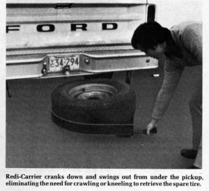 Swing-Out Carrier Totes Spare Tire TIRES/WHEELS Miscellaneous 1-4-14 "This simple mechanism allows you to remove the spare tire from under your pickup in 30 seconds without having to kneel or crawl under it," explains Frank Caughey, of Fairmont Steel Products, Fairmont, Minn. "It swings the tire out to you and has no nuts or bolts to rust or freeze up."