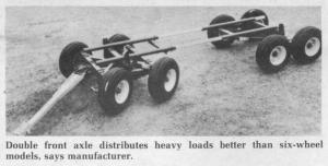 "The problem with conventional six-wheel wagons is that, under heavy load, the single front axle gets overweighted," explains Sas. He solves the problem by putting a second steerable and oscillating axle up front. He buys new six-wheel wagons (four behind and two up front) from Knowles Mfg., Glenbeulah, Wis., then installs the second front axle himself at a shop in Rochester, Minn.