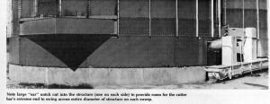 Easy servicing ù You never have to crawl inside the structure to service the unloader. Its cutting bar is the only part of the machine which goes inside the structure, with the rest positioned outside at ground level for easy accessibility for maintenance and servicing. Even the cutter bar chain, with stainless steel bushings and pins, can be examined from outside the silo during every revolution of the chain around the cutter arm. Hanson likens the machine to "a gigantic chain saw with the blade of the saw buried in a log and the prime mover in the hands of the operator." He notes that "the Hoy company, with more than 11 years' experience with the unloader in England and other European countries, proudly boasts that it has never had to dig into a silo to extract a Hoy unloader - as has often happened with conventional bottom unloaders on the market."