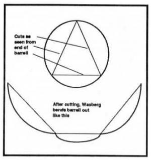 He cut a triangular-shaped piece out of the end of each drum and made a cut down the length of the barrel. Then he bent each barrel out and welded the four barrels together end to end. He welded pieces of barrel onto either end and attached boards for seats down the sides and across the middle.