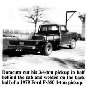 Dumcum cut the 3/4-ton model in half behind the cab and welded on the back half of a 1979 Ford F-3501-ton pickup equipped with dual rear wheels. He then mounted a Hillsboro 8-ft. long flatbed equipped with a headrack onto the frame.