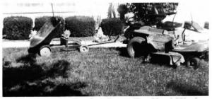 "I used the frame and wheels from the mower, and mounted an old wheelbarrow on top with a hinge at the back end of the trailer so that it dumps its load just behind the rear wheels. It's so sturdy I've used it for picking rocks in the field. The front steering axle makes it follow in the tracks of the garden tractor."