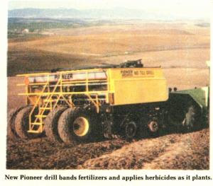 They're calling it the first true no-till drill and the biggest thing to cross the prairie since the buffalo roamed. It's the giant-size new no-till drill from Pioneer Manufacturing which can apply as much as 2,000 lbs. pressure per seed opener while banding phosphates and nitrogen around the seed, and applying herbicides to control weeds.