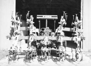 The 3-section, 30-in. row cultivator has four sets of sweeps on the main frame and two on each wing. A pair of hydraulic cylinders are used to fold the wings up and over until they're parallel to the main frame. The wings can be folded individually or simultaneously.