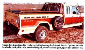 Options include headache rack, side rails, notched tailgate, removable tailgate, spare tire carrier, step-on bumper, and 1/8, 3/16, or 1/4-in. steel floor. A polyurethane box liner is available and box can be galvanized.