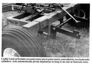 The two-wheeled "Auto Kaddy", which is fitted with a 3-pt. hitch at rear, simply hitches to the tractor drawbar and is powered by the tractor's hydraulic outlets. The caddy's axle articulates around a center pivot point and is pushed and pulled by a pair of hydraulic cylinders. When the implement drifts, the axle automatically pivots the implement to keep it on or between the rows. A set of "wands" under the axle follows the row, sending signals to an electric control box.
