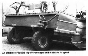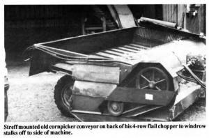 Streff totally enclosed the 3-ft. wide conveyor that runs across the back of the chopper. An orbit motor is used to power the conveyor and to control its speed. " I t saves a lot of time baling stalks," says Streff, who feeds beef cattle. "We make double windrows by dumping onto the windrow from the previous pass after turning at the end of the field. The conveyor drops chopped stalks into the middle of the fourth chopped row so they don't get chopped twice. It makes a 3 to 5-ft. wide windrow. We used it last fall for the first time and were amazed how well it worked. We made about 500 bales. We were afraid that air pressure coming out of the flail chopper would cause the stalks to bunch up, but that wasn't a problem. We plugged it up only once or twice all year. When it does plug up, stalks come out the bottom of the chopper while the apron on the conveyor keeps running.