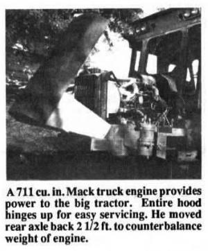 Langerman built the tractor out of an old 4-WD articulated loader tractor that was equipped with a front-end loader and a small 6-cyl. gas engine. He stripped the tractor down to the frame and replaced the original engine with a 711 cu. in. diesel engine taken from a Mack semi-truck. He also installed the Mack truck's 5-speed transmission, 2-speed Browning transmission, and radiator. The new engine was heavier and longer than the original one so he moved the rear axle back 2 1/2 ft. for better weight balance. He also mounted 16.9 by 24 dual tires on both axles. A 2-speed power divider salvaged from a 5-ton Army truck provides 4-WD. The transmission's output shaft is connected to the power divider's input shaft, which is connected to the front and rear axles.