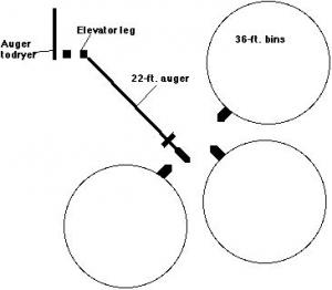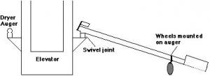 "The discharge end of the 22-ft. auger mounts on the elevator leg with a swivel joint. The hopper end of the auger is fitted with wheelbarrow wheels that make it easy to move from bin to bin."