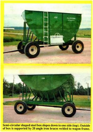 "It works 100% better than conventional gravity wagons because it always empties out completely," says Salzsieder. "Every part of it slopes so grain can't stick. It's also built heavy. Conventional gravity wagons are prone to damage from twisting. I do custom combining and it seemed like I was always making welding repairs to wagons. The frame on my wagon is built from 3 by 8-in. steel tubing and is mounted on big 9.00 or 11.00 by 22.5 truck tires. The wagon is made from 14 ga. steel. The interior seams have no lap welds so it won't rust out if you haul fertilizer."