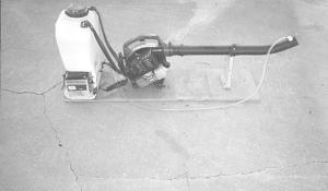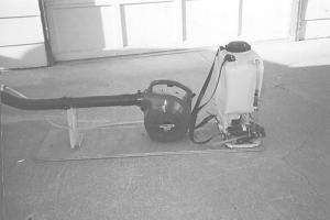 The backpack sprayer was originally equipped with a pump handle on one side to pressurize the tank. Heller removed the handle and mounted a small liquid pump and a 12-volt motorcycle battery onto a 1/ 4-in. thick plastic plate that he attached to the bottom of the tank. He then ran a small hose from the pump to a spray nozzle inserted into the end of the leaf blower pipe. A by-pass valve on the intake side of the pump is used to control the flow of liquid from the spray tank.