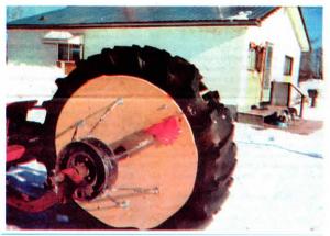 Six 3-ft. long rods run from the plywood on one side of wheel to an old wheel hub Brosinsky had on hand. Six 18-in. lengths of 2-in. dia. galvanized pipe fit inside the tire, pushing outwards on both sides to keep the tire spread to hold grain.
