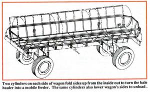 The wagon has movable, hydraulic-controlled sides that move into different con-figurations as needed. When in the flat, horizontal position, the 18 1/2-ft. long wagon functions as a conventional bale carrier, handling 10 to 18 round bales depending on size. When hauling wide bales, the sides of the wagon slide outward, widening the wagon from road-legal width of 8 1/2 ft. to 10 1/2 ft. The sides of the wagon can be tilted upward to tightly hold it's load of bales, stabilizing the load.