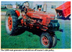 They mounted the 5,000-watt unit on a bracket at the front of a Farman H, driving it with two belts off the tractor's side pulley. They used a Farmall because the reliable old tractor always starts.