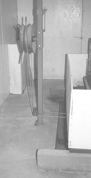 McKay's farrowing room is arranged with three rows of farrowing crates, with five crates per row. The ends of the crates rest on top of 8-in. high concrete curbs. He made three 6 1/2-ft. long, 4-in. high, 1/4-in. thick scraper blades, one for each row of crates. Each blade connects to a continuous stain-less steel cable that runs to a car wheel rim mounted on a steel pipe. The end of the pipe is welded to a 6-in. length of 2 1/2-in. steel tube that's free to slide up or down on a vertical 2-in. sq. steel tube. The 2-in. steel tube is lag bolted to the floor and ceiling next to a gutter. The cable wraps around the wheel rim and over a pair of pulleys that are bolted on near the bottom of the 2-in. sq. tube.