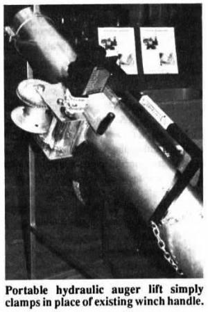 The "Simpalift" makes use of the auger's existing winch. It consists of a U-shaped metal frame with an orbit motor on one end and a hold-down chain on the other. You replace the winch's crank handle with an adapter bracket that attaches to the orbit motor, and then wrap the hold-down chain around the auger tube. The orbit motor is powered by the tractor's hydraulic system with the engine running at idle.