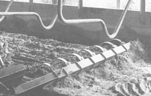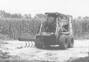 It consists of seven 1-ft. long spring cultivator tines mounted with U-bolts to a telescoping beam made of steel tubing. It quicktaches directly to the front of most skid steer loaders and swings from side to side 180? as needed.