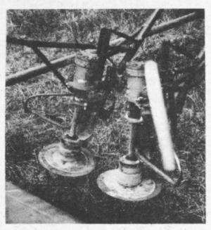 The machine consists of a V-shaped, two-wheeled rig 12 ft. long that trails behind the tractor drawbar. The wheels are mounted on an "overhead axle" that loops 6 ft. over the operator's seat in the center. Just below the seat are two horizontally-mounted discs each equipped with it's own hydraulic motor as well as hand and foot controls. The spinning discs move in and out and up and down, each controlled independently by the foot and hand action of the operator. One disc turns clockwise and the other counterclockwise.