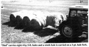 The bale sled carries eight 4 by 5-ft. bales and a ninth bale is carried on a 3-pt. mounted bale fork. "It doesn't damage the field, and it slides smooth and easy," says Haggard, noting that the bale sled works best on relatively flat fields. There's nothing on the surface of the sled to hold the bales in place. It's just a flat, steel surface."