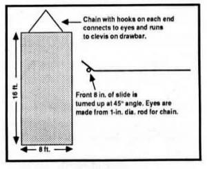 "I had a machine shop weld two 8 by 8-ft. sheets of plate steel together. Then they used a press break to turn up 8 in. of one end at about a 45 degree angle. Then they used 1-in. dia. rod to make an eye for either side of the sled to attach to tow chains. The eyes are welded to the sled just under the front bend," says Haggard.