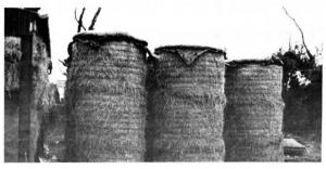 A piece of poly is tied over the top of the bale with a turn or two of twine. Rain then runs down the sides of the bales with little damage to the hay or straw inside. Some farmers who've tried the idea suggest putting a bit of barnyard "muck" on top of the plastic in order to keep it from ripping off in the wind.