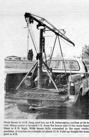 Suppose bales are being loaded from ground level, or from a stack onto a large truck. The man operating the boom drives the pickup into position and sets the boom at the proper angle for "pitching" bales from stack to truck. Once set, the boom remains stationary at this angle. A 3/8 in. nylon rope with a special bale hook attached is mechanically raised and lowered by the unit's drive mechanism - an automotive rear end equipped with a rope drum. The operator pulls a separate rope operating a brake on the drum mechanism with one hand, and jabs the hook into the bale with the other. With the hook secured into the upper third of the bale, he pulls the trip rope, causing the main rope to immediately wind around the drum. As it winds, it lifts the bale and slings it up and away to the top of the loader stack. UVith experience, the operator can set a bale on top of the load and put it within a few inches of where he wants, says Higginbotham. To retrieve the hook for the next bale, he simply pulls a hose which is attached to the hook and which rides up with the bale. One jerk on the hose brings the hook down in a couple seconds. The operator then grabs the hook, jabs it into the next bale and, with his other hand, jerks the trip rope to send up another bale.