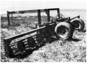 The wings of the crumbler fold hydraulically for transport. It also raises and lowers hydraulically on lift assist wheels and stub shaft axles that Vorwald made. Tires, which lift completely off the ground when the clodbuster is being used, are 1lL by 15-in.