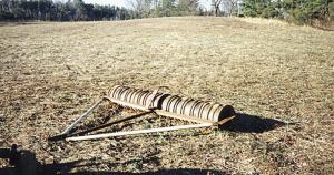Norris used 15 14-in. dia. rims welded together in a row. He made a frame out of 3 1/2-in. angle iron and fitted it with an A-frame tongue out of 1 1/2-in. dia. plumbing pipe. Overall width of the tool is 12 ft. and it's 10 ft. long with the tongue.