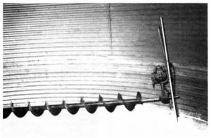 The gearbox mounts on "legs" made from a pair of 3/4-in. dia. pieces of metal conduits. The auger was salvaged from an unloading auger off an old IH 140 combine. It attaches to one end of the rototiller's beater shaft. A 1/3 hp electric motor is used to belt-drive the gearbox which in turn drives the beater shaft. A shield covers the V-belt and pulleys on the motor and transmission.