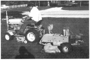 Reisner pulls the mower behind his 18-year-old 10-hp. Cub Cadet lawn tractor with a 42-in. deck. In second gear, it used to take 2 1/2 hrs. to mow 2 1/2 acres of lawn. The add-on deck cut mowing time nearly in half and reduced fuel consumption to nearly half by the Cub Cadet. The Sidewinder uses just "two cups" of gas for the 2.5 acres.