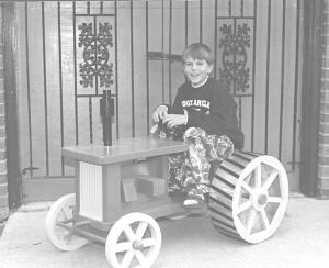 This sharp little wooden tractor is painted to look like a Deere and was made by Jean Simoneau who lives in the rural Alberta town of Barrhead. It makes an eye-catching yard decoration. It's fitted with a wood crankshaft, smoke stack, steering wheel, gear lever, and seat. Strips of tin on the wheels that help simulate steel wheels are the only parts of the tractor not made out of wood.