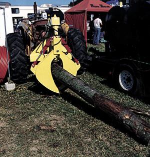The new 3-pt. log grappler was introduced at the recent Wisconsin Farm Progress Days show near Wausau. It consists of a set of "claws" powered by a pair of 2-in. dia. hydraulic cylinders that operate off tractor hydraulics. The claws have a maximum opening of 31 in. The entire unit is suspended on a hinge that allows it to swing forward or backward and also left or right when making turns.
