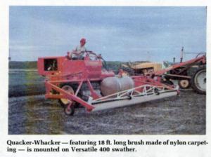 Dwight and several others involved in developing the new brushtype applicator have applied for a patent. They built the original prototype in 3 days last June, using a Model 400 Versatile hydrostatic self-propelled swather. They removed the header and replaced it with the Quacker-Whacker assembly.
