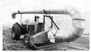 In flat fields already windrowed but not combined, the 8-ft. wide sweeper was operated between the windrows. It was also used in fields which had been windrowed and combined.