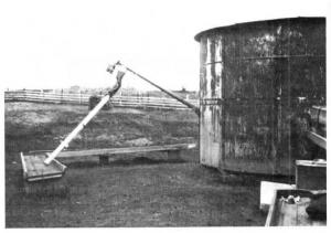 The 4-in. dia., 15-ft. long auger ex-tends out the side of the bin and is powered by a 112 hp electric motor mounted on top of the auger. Feed drops from the auger into a 5-in. dia., 10-ft. long flexible spout that telescopes out to 15 ft.