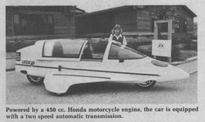 The car is outfitted with a 450 cc. Honda motorcycle engine with a 2-speed automatic transmission. Although it's not designed for fast acceleration, the car easily cruises at highway speeds or better, and has the capacity to go faster. The manufacturer says that the 123-in. wheelbase ù longer than many full-size autos ù gives the Litestar a better ride than most compacts.