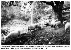 Robert Mock, breeder, found the sheep mentioned in old English sheep literature. They were the ancestors of today's Large Southdown sheep breed. "Up through the Depression years Baby Dolls were a popular breed," says Mock. "In those years, before refrigeration, meat wouldn't stay fresh for more than a couple meals so small animals were in demand. The animals were extremely docile and easy for the housewife or children to care for, providing both meat and wool. When commercial refrigeration was introduced, demand grew for a larger meat carcass and the little sheep began to disappear."