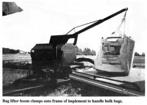 The new bag lifter bolts onto any implement frame strong enough to withstand a 2,000-lb. load. It consists of a telescoping boom that hydraulically lifts and swings bulk bags from the transport vehicle to the implement. The unit has two hydraulic cylinders operated by a double spool valve. One cylinder raises or lowers the boom and the other swings it up to 180 degrees from side to side.