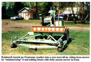 Mower Made From Self-Propelled Swather HAY & FORAGE HARVESTING Mowers (38) 18-5-23 "It works as good as anything on the market and cost less than $1,000 to build," says Werner Reinhardt, Didsbury, Alberta, who turned an Owatonna self-propelled swather into a zero-turn 60-in. riding lawn mower by "miniaturizing" it.